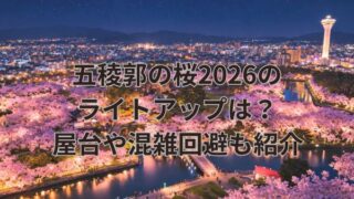 五稜郭の桜2026のライトアップについて、「いつから始まるの?」「屋台は出る?」「混雑を避けるには何時がいい?」と気になっている方も多いのではないでしょうか。五稜郭公園は函館を代表する桜の名所として人気ですが、ライトアップ期間や点灯時間、屋...